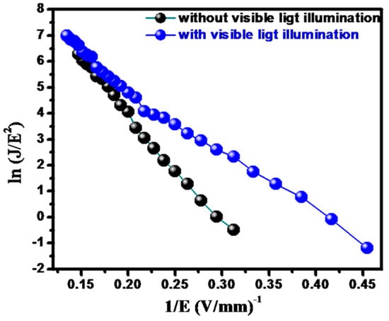 Figure 7 shows an interesting enhancement in the field emission properties of SrS/Bi2S3 composites when photons of visible wavelength incident on the field emitter samples. It shows noticeable decrement in turn-on and threshold fields with visible light illumination []. With visible light illumination, the SrS/Bi2S3 emitter shows a turn-on field of ca. 2.50, 2.37, and 2.10 V/µm and a threshold field of ca. 3.20, 2.68, and 2.80 V/µm, respectively, for the anode–cathode separation of ca. 2 mm, which are very low values of the turn-on and threshold fields as compared to the values without visible light illumination. As the applied field increases gradually, the emission current density is observed to increase exponentially and a maximum emission current density of ca. 527, 264, and 254 μA/cm2 is drawn at an applied field of ca. 7.4 V/μm without light and a current density of ca. 1078, 284.8, and 173 μA/cm2 at an applied field of ca. 6.9 V/μm is observed as per the field emission theory. The observed J–E plots were analyzed using the Fowler–Nordheim (F–N) equation []. The result obtained is much superior to pristine Bi2S3 (Table 1). Figure 8 and Figure S1b,d,f in Supporting Information shows the corresponding F–N plot, i.e., plot of ln (J/E2) versus (1/E), (b, d, f) derived from the observed J–E characteristics. In both cases, the emitter has a semiconducting nature, which is confirmed over the entire range of the applied field in F–N plots with nonlinear behavior.