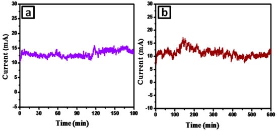 The emission current versus time (I–t) measurement of sample S3 was performed at a preset current value of ca. 10 µA over the period of 3 h and long-term stability over the period of 10 h was found to be fairly stable with 13.2 ± 10 mA current (Figure 9a,b). The appearance of spikes in the emission current is endorsed for the adsorption, desorption, and migration of residual gas molecules on the emitter surface.