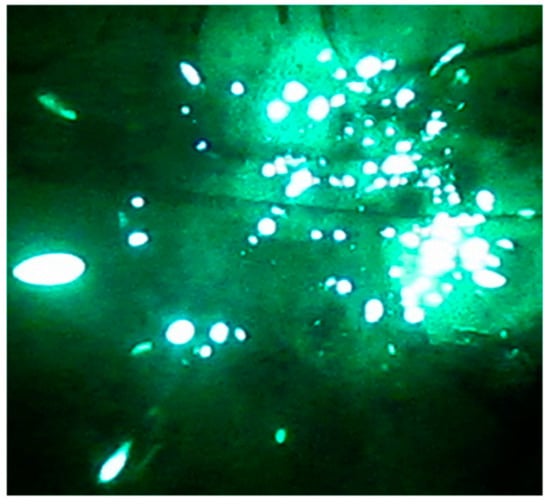 A field emission micrograph for sample S3 captured at the different applied fields shows a current density of ca. 400 μA/cm2 and displays a number of tiny bright spots (Figure 10), indicating that the emission is indeed from protruding emitting sites []. The temporal changes in the intensity of these spots are observed to be commensurate with the emission current fluctuation, depicted in the I–t plot (Figure 11).