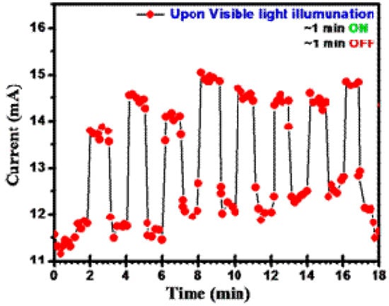 The X-ray diffractometer (XRD, Model-D8, Advance, and Bruker AXS, Billerica, MA, USA) was used to investigate the structure. The FESEM (Hitachi S-4800, Tokyo, Japan) and transmission electron microscopy (TEM, JEM-2200FS, JEOL, Tokyo, Japan) were used to confirm the morphology and crystal size. Samples for TEM analysis were prepared by drop casting solutions onto carbon-coated copper grids followed by drying. The UV-Visible spectrometer (PerkinElmer Model-lambda-950, Rodgau, Germany) was used for optical study. The photoluminescence of the synthesized material was recorded on a Horiba Fluorolog-3 spectrofluorometer with an excitation wavelength of 420 nm. The variation in current was measured by an electrometer workstation (Keithley Electrometer, 6517B, Cleveland, OH, USA) with illumination of light (1500 LUX). We carried out Raman analysis for further investigation of the structural phases of the composite using a model HR-800-Raman spectrometer (Horiba JobinYvon, Paris, France 632).