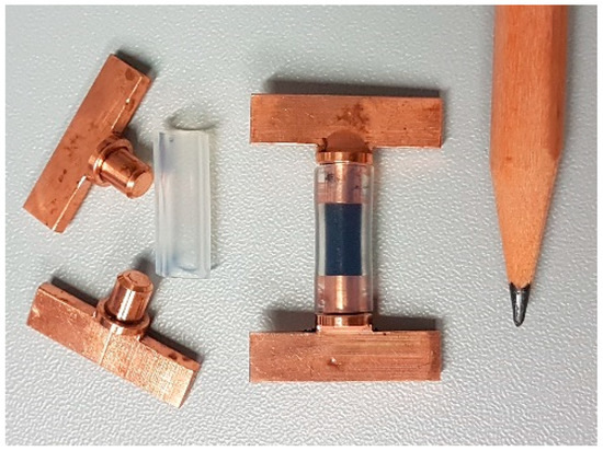 Tube and plugs for thermoelectric measurements on powder samples (pencil for size comparison).