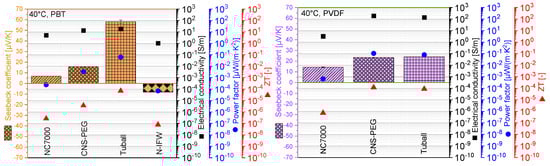Not only the type of carbon nanotubes influences the TE properties of polymer/CNT composites, but also the polymer type. At the same MWCNT content, the S-values of PVDF composites were higher than those of the other composites. For composite materials filled with 2 wt % SWCNT Tuball, the highest Seebeck coefficient of 58.2 µV/K was determined in the PBT matrix. The highest Seebeck coefficients obtained in this study were 66.4 µV/K (PBT/7 wt % SWCNT Tuball) and −59.0 µV/K (PA6/0.5 wt % SWCNT Tuball) for p- and n-type composites, respectively. The highest power factor and ZT of 0.28 µW/m·K2 and 3.1 × 10−4, respectively, were achieved in PBT with 4 wt % SWCNT Tuball.