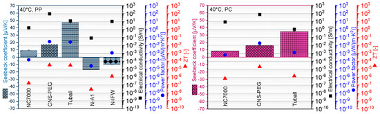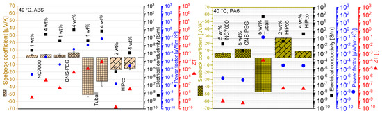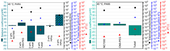 The results for composites based on different polymer matrices with 2 wt % of different CNTs are summarized in Figure 2, Figure 3, Figure 4 and Figure 5 and Table 5. For ABS and PA6, additional results are shown for different CNT contents. It was found that all composites containing MWCNTs NC7000 or CNS-PEG exhibit a positive Seebeck coefficient whereby the S-values for polymer/CNS-PEG composites are always higher than those for composites with NC7000. This result correlates with the higher S-value of buckypaper based on CNS-PEG than the one made of NC7000.