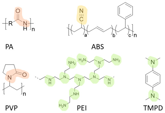Molecular structure of polymers resulting in negative Seebeck coefficients: PA, ABS (as used in this study) and poly(vinyl pyrrolidone) (PVP), poly(ethylene imine) (PEI) and N,N,N′,N′-tetramethyl-p-phenylenediamine (TMPD) (as applied in [15]).