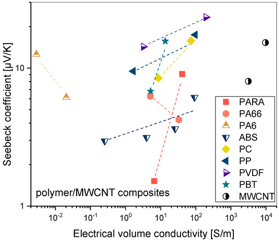 In addition, the electrical network structure of the CNTs in the composite is important for the TE properties. The comparison of the same CNT kind in different matrices shows that the TE properties are also significantly dependent on the polymer type. For example, the Seebeck for composites filled with 2 wt % NC7000 varied between 1.5 µV/K (PARA, 6.3 µV/K (PA66), 6.8 µV/K (PBT), 8.5 µV/K (PC), 9.5 µV/K (PP) up to 14.3 µV/K (PVDF) (see Table 5). It has to be considered that the different composites may have different states of the conductive network, as the processing conditions were different which are known to significantly influence the state of the CNT dispersion and network formation [35,36]. In addition, the interactions between the polymer types and the CNTs are different. This results in different nanotube dispersibility and dispersion. The relationship between the amount of non-dispersed CNTs (determined using transmission light microscopy at 1 vol % loading of MWCNTs Baytubes C150 HP, Bayer Material Science, Leverkusen, Germany) and the calculated interfacial energy between CNTs and some polymers is described by Kasaliwal et al. [36]. The comparison showed very low interfacial energy and good macrodispersion for PA66 and PC, but worse dispersion and higher interfacial energy for PP. One also may argue that the distance between the actual used CNT concentration of 2 wt % and the electrical percolation threshold concentration are different when using the various polymer matrices, so that the composites are compared at different network states.