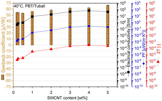 Exemplarily, for three polymer matrices the influence of SWCNT content on TE properties was studied. On the one hand, p-type PBT/SWCNT Tuball composites (Figure 8, Table 7) are considered as p-type composites, and on the other hand, ABS/SWCNT Tuball (Figure 9, Table 8) and PA6/SWCNT Tuball (Figure 10, Table 9) as n-type composites.