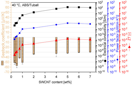 For the n-type ABS/Tuball composites, a maximum negative Seebeck coefficient of −57.1 µV/K was found at 0.5 wt % Tuball. Especially at higher CNT content, the S-value increases up to −29.7 µV/K at 7 wt % SWCNT. However, due to the increasing electrical conductivity, the power factor and ZT value increase with the CNT content to values up to 0.14 µW/m·K2 and 1.6 × 10−4, respectively. Thereby, mainly due to the significantly lower values of conductivity in ABS/SWCNT as compared to PBT/SWCNT, the PF and ZT values were lower compared to the values of PBT/SWCNT composites.