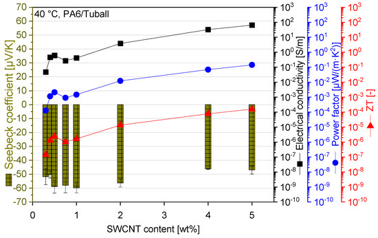 For PA6 composites filled with 0.3–5 wt % SWCNT Tuball, the thermoelectrical measurements shows n-type behavior. The highest Seebeck coefficient was found at −59.0 µV/K for PA6/0.5 wt % SWCNT. As with ABS/Tuball composites, the S-value increases with the SWCNT content to −46 µV/K to −47 µV/K (4–5 wt % SWCNT). It has been observed in both ABS and PA6 matrices that a lower amount of SWCNTs can obviously be doped more strongly by the surrounding polymer chains, leading to a higher absolute value of the S-value than at a higher SWCNT contents. In the p-type composites based on PBT no such doping occurs and the S-values are more dependent on the conductive network formation.
