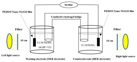 Schematic illustration of the photoelectrochemical concentration (PEC) cell studied in this work, utilizing poly(3,4-ethylenedioxidethiophene) (PEDOT)/nano-Ni/reduced graphene oxide (rGO) films for water-splitting with no external voltage applied. A light-driven anode for catalysis of the oxygen evolution reaction (OER) (in the left-hand half-cell) is combined with a light-driven cathode for catalysis of the hydrogen evolution reaction (HER) (in the right-hand half-cell). A hydrogel bridge is provided between the two half-cells. A photograph of the PEC cell set-up is provided in Figure S1 (Supplementary Materials).