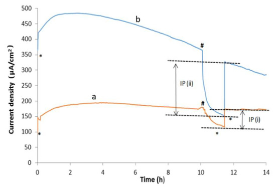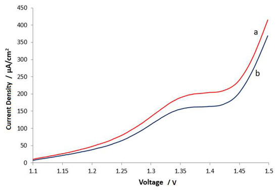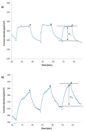 As can be seen in Figure 3a, when 1.23 V was applied, the “dark” current (without light illumination) was 140–142 µA/cm2. When the lights were switched on, the current increased to 154–156 µA/cm2. Thus, the photocurrent arising from the light illumination (IP(i) in Figure 3a) was 14 µA/cm2.