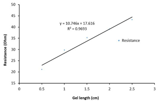 Resistance as a function of length of the hydrogel separator used in this study (prior to operation in the cell). The geometric area of each electrode was 4 cm2.
