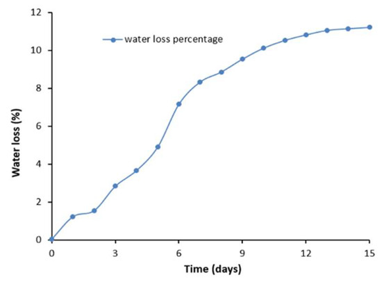 Finally, the hydrogel sample was stored at room temperature (21 °C) and 50% relative humidity (RH) to test its water retention capacity over 15 days. Samples exhibited gradual shrinkage as shown in Figure 8. After 15 days, the water loss of the hydrogel was 11% and no longer changed. The main reason for the slow water loss during this period is the fact that CsCl salt is a hygroscopic agent. It absorbs moisture from the air to balance the water content and substitute the water loss in the hydrogel. For this reason, the hydrogel remained rich in water, enhancing its mechanical and electrical durability when compared to other gels [13,15,17].