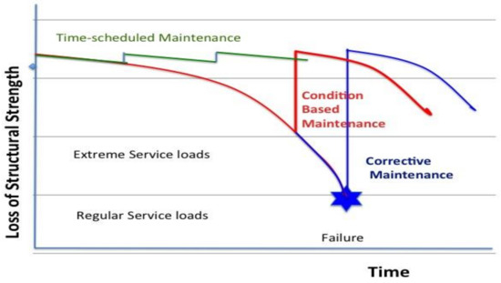 - The purely corrective maintenance strategy, which involves doing nothing until failure is clearly visible; it has the advantage of having the lowest initial costs. Among its disadvantages, besides the risk of catastrophic failure, are the fact that damage growth by usage occurs faster and faster, meaning repairing costs may be higher; the structure will be out of service at an unpredictable date, so maintenance cannot be scheduled. It is only acceptable for low responsibility, very lightly loaded structures (the level of service loads and overloads also influences the slope of the degradation curve).