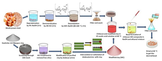 - Biswas, S.; Rashid, T.U.; Mallik, A.K.; Islam, M.; Khan, M.N.; Haque, P.; Khan, M.; Rahman, M.M. Facile Preparation of Biocomposite from Prawn Shell Derived Chitosan and Kaolinite-Rich Locally Available Clay. Int. J. Polym. Sci. 2017, 6472131. [Google Scholar] [CrossRef]