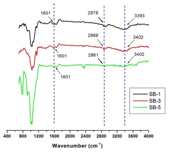 The composite fabrication starts with chitosan extraction and clay modification. The conversion of chitin to chitosan is a sophisticated task that requires extra attention at the deacetylation step. Moreover, modification of clay requires sophisticated handling of materials under certain conditions. Successful extraction of chitosan, modification of clay, and fabrication of the composite film were confirmed by detailed FTIR analysis, as discussed in our previous work [24]. However, in this work, the fabrication of the three composites (SB-1, SB-3, and SB-5) in bead form was analyzed by FTIR. While studying the FTIR spectra of the composites, the characteristic peaks of chitosan (at 1601 cm−1 (N–H bending) and 3402 cm−1 (O–H stretching overlapping the N–H stretching of primary amine) and modified clay (at approximately 2900 cm−1 for C–H stretching of dodecylamine in MC) were observed, which confirmed the existence of these two components in the composites (Figure 2). The changes in intensities observed at these three peak positions support the corresponding ratio of chitosan and MC in the three composites. Moreover, the red shifts of the peak for N–H bending (from 1638 cm−1 in pure chitosan to 1601 cm−1 in the composite) and the peak for overlapping of O–H stretching and the N–H stretching of the primary amine (from 3448 cm−1 in pure chitosan to 3402 cm−1 in the composite) indicate the possible interaction between functional groups of -NH2 and -OH with the -OH of MC. All other important groups from CHT and MC were observed in the FTIR spectra of the composites, resulting in a comparable interaction of the elements. However, it is also noticeable that the FTIR spectra for the bead form composite is similar to that of film form composites (presented in our previous study [24]).