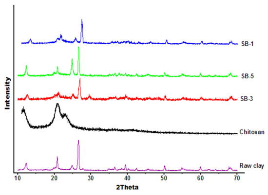 Comparison of XRD data of raw clay, chitosan, and composites (SB-1, SB-3, and SB-5).