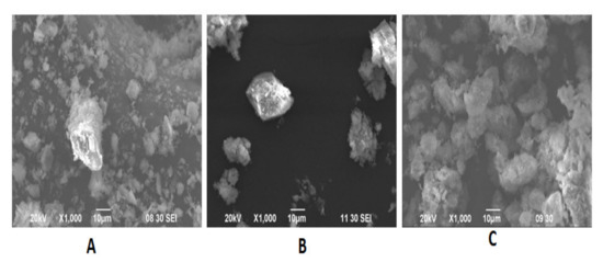 SEM images of (A) Raw clay at ×1000 magnification, (B) purified clay at ×1000 magnification, and (C) MC at ×1000 magnification.