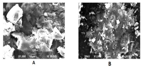 The morphologies of the raw clay, acid-treated clay, modified clay and composites (SB-1 and SB-5) were evaluated by SEM images at ×1000 magnification (Figure 4 and Figure 5). In Figure 4, the crystalline nature of the clay can be observed in the image of the raw clay, whereas a clear image of the acid-treated clay (purified clay) reveals the removal of unbound silica and other impurities incorporated into the raw clay with clay minerals [24]. In the last image of Figure 4, in modified clay, smooth but discrete spherical particles can be observed that confirm the incorporation of the organic modifying agent into the inorganic clay materials.