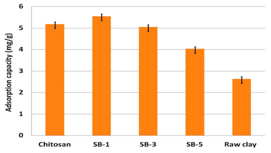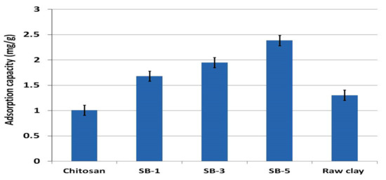 Being a cationic dye, MB was adsorbed in the highest amount on composite SB-5 compared to CHT, MC, and the other two composites (Table 2) (Figure 6). The lowest adsorption capacity was observed for SB-1. The better adsorption of MB by SB-5 is attributed to the cationic nature of MB and the anionic nature of the clay-rich composite in alkaline solution. The -NH2 of chitosan in basic solution became neutral and in acidic media, it became positively charged (NH3+). Hence, cationic dye adsorption on chitosan is believed to be lowered due to the absence of any interaction between the -NH2 and dye in solution. However, the presence of an -OH group in chitosan might result in some adsorption of MB, which was lower than the -OH group in clay. In SB-5, the amount of clay was higher than that of chitosan, and hence more anionic -OH clay sites were available for dye adsorption, in addition to the rough surface structure of the bead. In SB-1 the amount of chitosan was higher and, resulting in poor adsorption of methylene blue. A similar kind of phenomenon has been documented by many other researchers over the last decade [36,37,38]. A schematic diagram of the mechanism of MB adsorption by composite beads is depicted in Figure 7.
