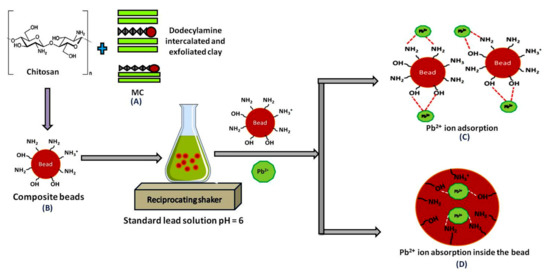 Proposed adsorption mechanism of Pb (II) on composite beads at pH = 6. (A) Dodecylamine molecules are intercalated or exfoliated on or within the clay structure and help to attach chitosan molecules to the clay. (B) Structure of bead showing -NH2 from chitosan and -OH from both chitosan and clay. (C) Adsorption of Pb2+on bead surface interacting with -NH2 and –OH. (D) Adsorption of Pb2+ within interior of beads.