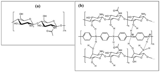 25]. In the case of biopolymer composites that contain chitosan and PANI, there is limited covalent cross-linking between polyaniline and chitosan, whereas hydrogen bond formation occurs between the –OH or –NH