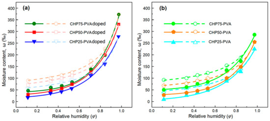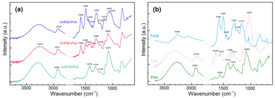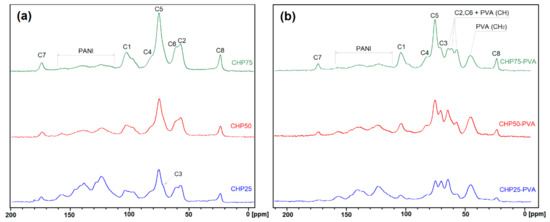Table S1 in the Supplementary Materials. In brief, the notation for the binary composites are defined according to the chitosan:PANI (CHT:PANI; w/w%) content indicated in parentheses: CHP25 (25:75), CHP50 (50:50), and CHP75 (75:25). The notation for the ternary composites differ according to the level of polyvinyl alcohol (PVA) content (w/w%), where the relative weight ratio of the aforementioned binary composite with PVA, is denoted by the following notation: CHP25-PVA, CHP50-PVA, and CHP75-PVA, where these composites contain 70% (w/w) PVA. The ternary composites that contain 50% PVA (w/w) are denoted by the following numerical index: CHP25-PVA50, CHP50-PVA50, and CHP75-PVA50.