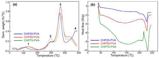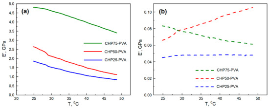 53]. As the sample is exposed to moisture, the trends in the change of the storage modulus become altered. For example, the CHP75–PVA composite samples decreased their storage modulus, while the CHP50–PVA composites showed an increase in storage modulus, while CHP25–PVA composites have a relatively constant storage modulus. Such behaviour can be explained when water is imbibed within the sample structure it diminishes its stiffness, resulting in the storage of more energy and an increase in the elastic modulus. The CHP50–PVA composite sample displayed similar behaviour in its wet state, where both the loss and storage moduli increased with elevated temperature.