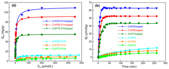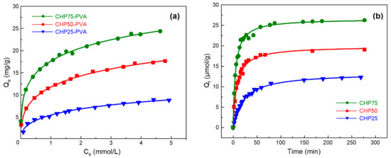 Figure 5a shows that composite samples with variable chitosan content had greater adsorption capacity, as follows: CHP75–PVA > CHP50–PVA > CHP25–PVA.
