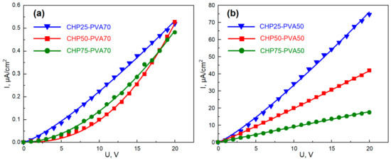 When the PVA content was reduced by 20%, the conductivity showed a 100-fold improvement. On the other hand, when the PVA content decreased, the dependence appeared to be more linear. For ideal cases, the current is described by Equation (11):