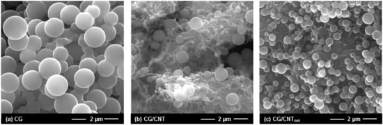 On the other hand, the specific surface area of the composite CG/CNToxi was 15% and 10% lower than that of the sample CG and composite CG/CNT (Table 1), respectively. This result suggests that the presence of CNToxi had an effect on the polymerization of glucose or the carbonization process, resulting in a material with lower microporosity. The shape of the isotherm at medium-high relative pressure, assigned to the presence of CNT, was similar to that of the composite CG/CNT, indicating that the oxidation of the CNT did not alter the volume of pores of the composites. In fact, it was observed that CNToxi exhibited similar pore volume as the non-oxidized CNT (Figure S1). On the other hand, the external surface areas were also modified due to the presence of CNT and CNToxi during the polymerization of glucose. The external surface area of CNT and CNToxi was much higher than that of sample CG (Table S1), and hence, the composite exhibited a larger external surface area than sample CG, demonstrating the presence of CNT inside the structure. However, although the same amount of CNT and CNToxi was introduced for the preparation of the composites, differences in the external surface area were observed. This result indicates that the presence of CNToxi during the hydrothermal process modified the polymerization reaction, resulting in a material with a higher external surface area. So, to better understand the morphological changes resulting from the incorporation of CNT and CNToxi during the polymerization of glucose, the samples were examined by scanning electron microscopy (SEM). Sample CG was composed of spheres of 0.69 ± 0.09 µm diameter (Figure 2a), which is a typical morphology of hydrothermal carbons [20,23]. The presence of CNT gave rise to an inhomogeneous material with two different carbon sphere size distributions (0.24 ± 0.03 µm and 0.40 ± 0.05 µm), while the incorporation of CNToxi resulted in a homogenous material with carbon spheres of 0.25 ± 0.04 µm.
