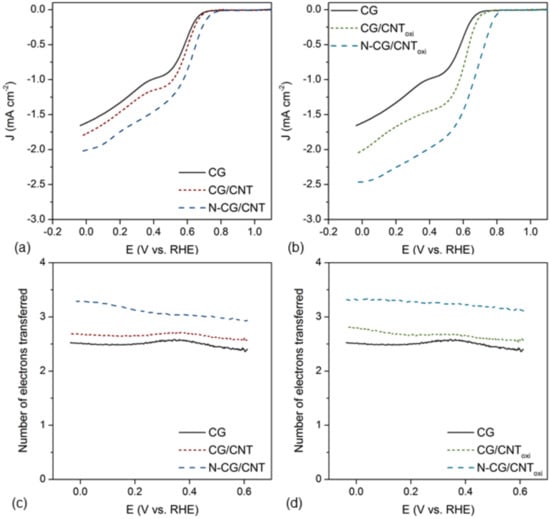 Two crucial parameters can be obtained from the LSV: the onset potential (V) and the limiting current density (mA cm−2), their values being shown in Table 3. The onset potential increases by the formation of the composite (3%) and the incorporation of nitrogen (7%), probably due to the higher amount of active sites provided by the CNT and the nitrogen functionalities. Similar results were obtained for the composites prepared with CNToxi (Figure 5b), increasing 6% the onset potential due to the introduction of CNToxi and 13% more due to the nitrogen functionalities. So, the most remarkable enhancement was observed for the N-doped composite N-CG/CNToxi, shifting the onset potential from 0.66 (sample CG) to 0.79 V. This value is similar to those previously reported for biomass-derived carbons [24,38]. The limiting current density also followed the same trend. However, in this case, the increase could be attributed to the higher electrical conductivity of the samples, as a direct relationship has been found between the limiting current density and the electrical conductivity (Figure S5). These results demonstrate the importance of incorporating CNT into the hydrothermal carbon structures, especially CNToxi, and introducing nitrogen functionalities. Besides, the measurements performed using an RRDE allow evaluating the efficiency of the oxygen reduction process by calculating the production of sub-products during the reaction (Table 3), which is related to the mechanism of the reaction. Sample CG produced a considerable amount of sub-products that decreased due to the presence of CNT, and the drop was even more significant upon the incorporation of nitrogen functional groups. These results were correlated with the number of electrons transferred, a number of electrons transferred close to 4 indicating that the oxygen reduction was accomplished in a single step, while a number close to 2 corresponded to the production of sub-products. So, from the values shown in Figure 5c,d, it could be concluded that the incorporation of CNT and CNToxi did not seem to produce any significant effect on the reaction mechanism, as the values obtained were quite similar to those of the carbonized glucose (CG). However, the introduction of nitrogen functionalities results in a noticeable improvement in the efficiency of the oxygen reduction, as the N-doped composites shift the mechanism of the reaction towards the four-electron pathway (number of electrons transferred = 3.3, measured at −0.2 V). This value is higher than those previously shown for HTC [24,38]. This effect is due to the presence of nitrogen into the carbon structure that improves its electronic structure and chemical reactivity [15].