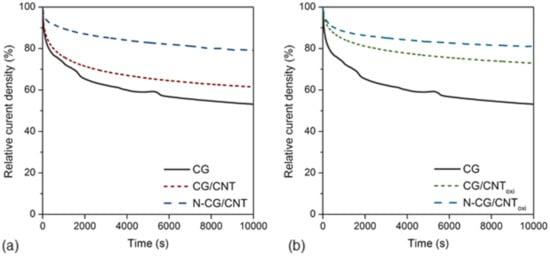Another important parameter that is commonly used to evaluate the activity of the electrocatalysts towards the ORR is the kinetic current density (Jk), which is calculated from the Koutecký–Levich equation (Equation (S13) shown in the supporting information). The Jk value calculated for N-CG/CNToxi was higher than that of composite N-CG/CNT (Table 3) despite both having a similar nitrogen content, which suggests that the presence of nitrogen was not enough to enhance the reaction. This difference in the Jk values of the N-doped samples could be due to the type of nitrogen functionalities or to the modification produced by the incorporation of oxidized CNT. The comparison between composite N-CG/CNT and CG/CNToxi (composites with similar onset potential and JL) revealed that, in these samples, the improvement in the Jk value was due to the modification of the physico-chemical properties produced by the introduction of CNToxi during the polymerization of the glucose, as CG/CNToxi exhibited a higher Jk value than N-CG/CNT. The long-term stability was another critical parameter to assess the performance of carbon materials as electrocatalysts towards the ORR. Therefore, the durability of all the samples was tested by chronoamperometry performed at 0.4 V vs RHE for 10000 s (Figure 6). It can be observed that the carbonized glucose sample lost 53% of its initial current density, which was already the lowest current density registered (Table 3). Nonetheless, the stability was highly increased by introducing CNT and CNToxi (13% and 27% more retention than CG, respectively) and was even further increased by the introduction of nitrogen. In fact, the N-doped composites exhibited a current density retention of more than 80%, especially composite N-CG/CNToxi. Therefore, taking into account all the important electrochemical parameters, composite N-CG/CNToxi exhibited the highest electrocatalytic performance, which could be attributed to its high external surface area, its higher electrical conductivity, and the larger number of active sites offered by the quaternary and pyridinic nitrogen functional groups.