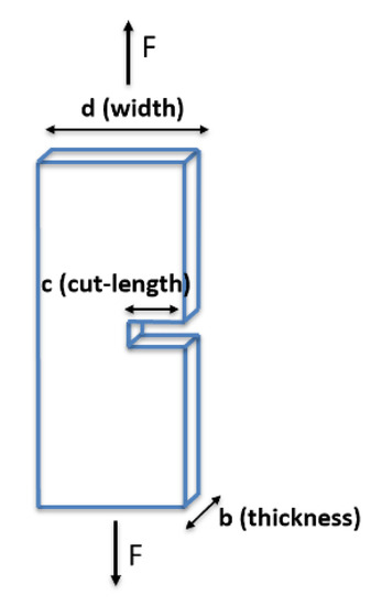 where is the area under the graph up to the point where the tear starts to propagate (Figure 2a), is the thickness of the sample, and is the length of the cut. A graph of versus the cut length shows an exponential trend—this asymptotically converges at higher cut lengths (Figure 2b). The final value is defined as the average value of the energies for cut lengths of 15 mm, 20 mm, and 25 mm (cut length that experiences minimum plastic deformation).