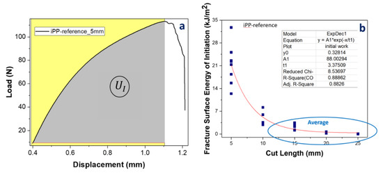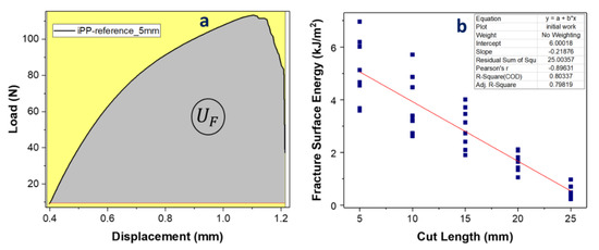 (a) Typical load displacement denoting the area of UF for the complete fracture and (b) a plot of the total fracture surface energy vs. the cut length, presenting the linear regression fit from which γF was calculated (for iPP-reference).