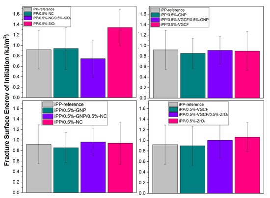 Figure 3 indicates that there are no significant differences between the fracture energies of initiation (γI) among the different samples. The iPP/0.5%-SiO2 has the highest value, while its hybrid composition presents the lowest along with NC. The initial energy is the summed energy up to the point where propagation starts.
