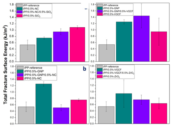 Another system that presented a large fracture energy improvement was the iPP/0.5%-SiO2 nanocomposite, which likewise exhibited a good affinity to the iPP matrix. Both the GNP and the SiO2 nanofibers have high surface areas, which may increase the adhesion with the iPP matrix, and, as a result, activate the mechanism of fracture energy dissipation more effectively.