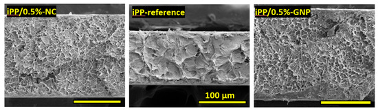 Cross-section SEM images (Figure 6) of the surface fracture show a surface suitable for fracture mechanism. All surfaces are rough and similar. The qualitative roughness of the composite samples is higher than the roughness of the neat iPP sample. This also has a lower fracture energy. Although only two samples are presented, all samples give similar observations. However, no quantitative measurements were done because this hypothesis has already been discussed in a previous paper [6].