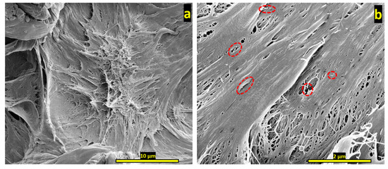 SEM images of iPP cross-sections after Mode I tensile testing at different magnifications. (a) Plastic deformation of stretched polymer at 10,000× magnitude and (b) crazing of the polymer at 50,000X magnitude. The dashed red circles show areas of crack bridging by microfibers.