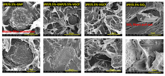 Figure 8 introduces the cross section of selected nanocomposites with superior properties. The system of iPP/0.5%-GNP that achieved the highest fracture energy among the parent composites demonstrates poor dispersion and large aggregates. However, there is substantial interaction between the polymer and the GNP. In contrast to the GNP, the VGCF are uniformly dispersed in the matrix, and single fibers are observed throughout the sample. The hybrid system also presents well dispersed VGCF alongside poorly dispersed GNP. The SEM images indicate that the GNP are found near the VGCF in the matrix, but the two fillers do not interact directly with each other. The last nanocomposite is iPP/0.5%-SiO2, which also has increased fracture energy. The SEM image of this nanocomposite demonstrates good interactions between the fibers and the matrix—there are smaller aggregates here than are seen in GNP (bundles of a few fibers). The iPP/0.5%-SiO2 material also has pulled out SiO2 fibers. Hence, we see that the two main mechanisms that contribute to the increased fracture energy may exist simultaneously, regardless of the level of dispersion.