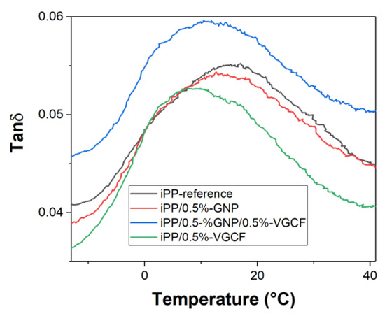 DMA results of tanδ for the chosen set (Figure 9) indicates the different behavior of the hybrid sample. The presence of GNP had no real influence on the tanδ, while VGCF decrease its value versus the neat iPP. Such a reduction may result from the restriction of polymer chain mobility by attraction with the nanofiller as described [15]. Unlike the VGCF, the GNP form aggregates, and therefore, have less common surface with polymer chains, and they do not limit the motion to the same extent [16,17,18]. Nevertheless, the contrasting responses of the two fillers lead to the highest ability to absorb energy, expressed in increased damping.