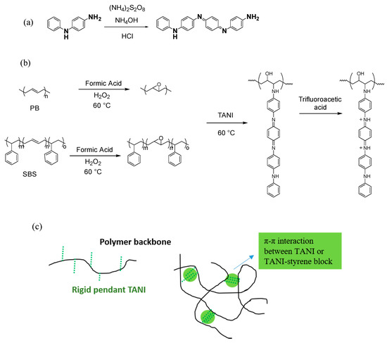 (a) the synthesis of TANI in the emeraldine base oxidation state. (b) The grafting of TANI to both SBS and PB and the oxidation of grafted TANI to the emeraldine salt oxidation state. (c) Schematic diagram showing π-π stacking regions between TANI oligomers or TANI-PS.