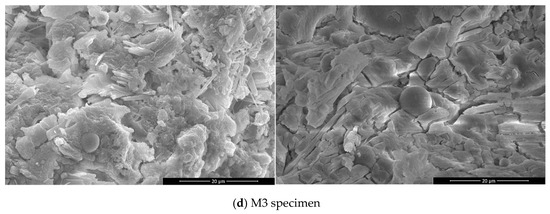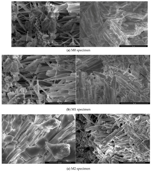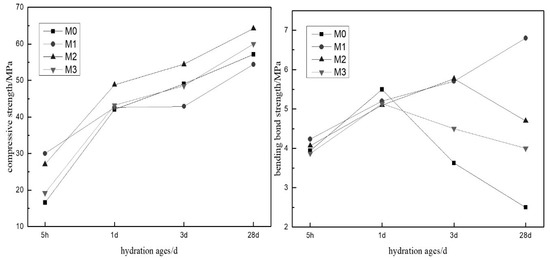 In the raw materials of MKPC, the density of MgO powder is 3.45 g/cm3, the KDP is 2.338 g/cm3, and the relative density of MKP is 1.71. Therefore, the volume expansion of mortar hardening body occurs in the early stage, and the contraction occurs after 1d. The dry shrinkage of mortar blocks is mainly caused by the evaporation of capillary water and the physical–chemical combined water that functions to dissolve and diffuse cement particles. The latter mainly includes adsorbed water and interlayer water. The density of main hydration product (MKP) is lower than that of powder. Therefore, the volume will increase with the hydration process, and the incorporated mineral admixture makes the hydration reaction more sufficient and strengthens the expansion. One part adjusts the pore structure of the hardened body, one part compensates the tensile stress of the capillary wall due to dehydration vacuum, and the other part appears as a volume expansion [28]. In this test, a blend with a smaller average particle diameter size was used as a micro-aggregate to fill between the larger-sized particles and the hydration product MKP, and form a dense gradation with a sufficient amount of unhydrated particles, Reduced water evaporation. The primary component of SF was , which did not participate in the hydration reaction and filled the pores in the hardened paste in the form of particles. Furthermore, volume deformation did not occur and resisted deformation, while MK and FA were obtained because of a secondary hydration reaction. Note that the amount of products reflects the deformation of the volume. FA improved the dispersion of particles in the paste, thus increasing the contact area of acid and alkali components, improving the reaction degree, and offsetting the shrinkage deformation after hardening. From Table 1 and Figure 4, because MK contains a large amount of , which reacts with phosphate to form (having a density lower than that of ), M2 expands; thus the bending bond strength on day 28 decreases.