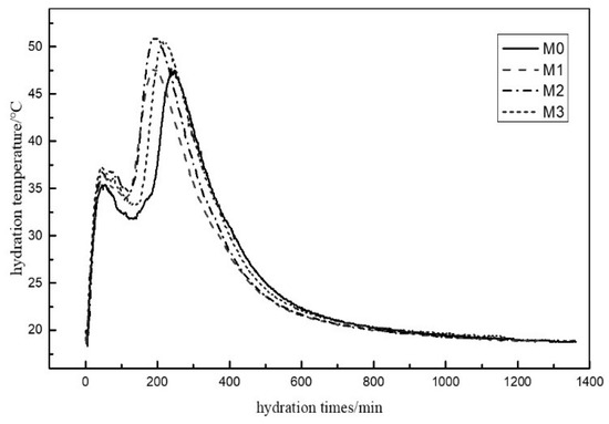 The hydration temperature curve of slurry can reflect the speed of hydration reaction. After adding mineral admixture, the raw material is relatively loose and porous, and the volume increases. After mixing the slurry with water, more water is needed for wetting. Furthermore, additional moisture was required after adding water and mixing, which caused the water that participated in the reaction reduced, the dissolvent reduced, the solute concentration increased, and the reaction speeded up; thus, the heat release of the reaction was brought forward. The solubility of contained in FA in M3 was higher than that of . The initial reaction with phosphate released a large amount of heat; therefore, the temperature peak of M3 was the highest. The SF in M1 had no active materials which participated in the hydration reaction: it simply advanced the reaction temperature peak, but did not change the highest temperature of the system.