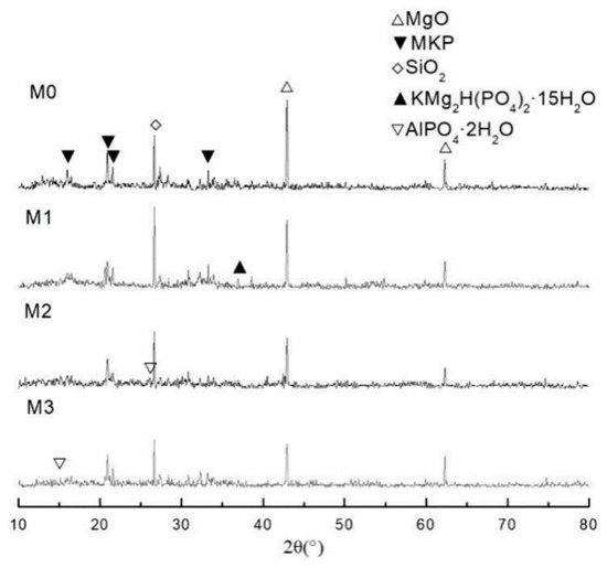 Figure 4 shows the XRD patterns of four different matching ratios after 28 days of natural curing. The figure shows that the positions of the primary characteristic peaks of all samples is basically the same and is primarily composed of the hydration product MKP, the unhydrated , and the fine aggregate containing . In the blank group, the diffraction peak strength of is higher, which proves that mineral mixed materials can make the hydration reaction of MKPC paste more complete. Furthermore, there is no new phase appearing in the blank group M0. The M2 had new physical phase high hydration phosphate . This material was the intermediate product of the hydration reaction of MKPC paste, which could react as reaction below and produce MKP [30]. The incomplete hydration reaction of the intermediate product led to a decrease in the M0 compressive strength. Both M2 and M3 contained Al–Si mineral mixed materials, where the active components of reacted with phosphate. Therefore, the characteristic peak of existed in all XRD patterns.