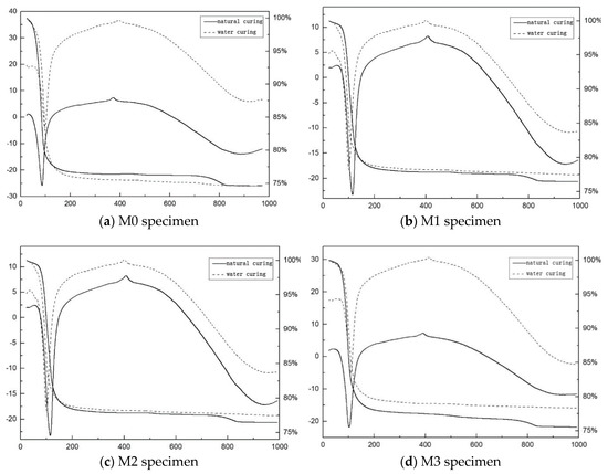 Figure 5 shows the TG/DTA curves of MKPC paste at aging for 28 days under different curing conditions. The figure shows that the geometry of DTA curves of four matching ratios under two curing conditions are basically the same with an endothermic valley and a smaller exothermic peak. The endothermic valley appears at ~100 °C, which is primarily the chemical process of the removal of crystal water from the hydration product MKP. The exothermic peak appears near 380 °C, which should be the physical process of the crystal form transformation of the sample, and then DTA curve offsets to the side of heat absorption (the lower side). Now, the specimen temperature has already reached or approached to glass transition temperature (Tg), the glass transition occurred for the sample, and the heat capacity increased. Both M1 and M3 under natural curing conditions show a small exothermic peak at 70 °C, which should be the hydration reaction of condensation between active and KDP without reaction after evaporation of water that hardly moved freely in the sample pores.