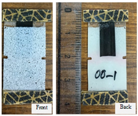 To observe the strain distribution around the carbon fiber tip of CF, a model composite was prepared. CF 25 mm in length was embedded into VE, cured at 80 °C for 3 h, then post cured at 100 °C for the same amount of time. Pre-cracks with an approximate crack length of 1.5 mm were prepared by a diamond cutter at both sides, then natural cracks were introduced by slicing a razor at the pre-crack root before testing. A white and black speckle pattern was painted in the sample surfaces for digital image correlation analysis (Figure 2). The sample size was 40 × 20 × 0.5 mm3. The tensile load was applied to the model specimen at a constant cross head speed of 1 mm/min.