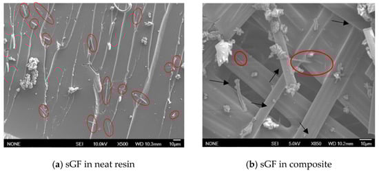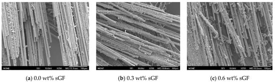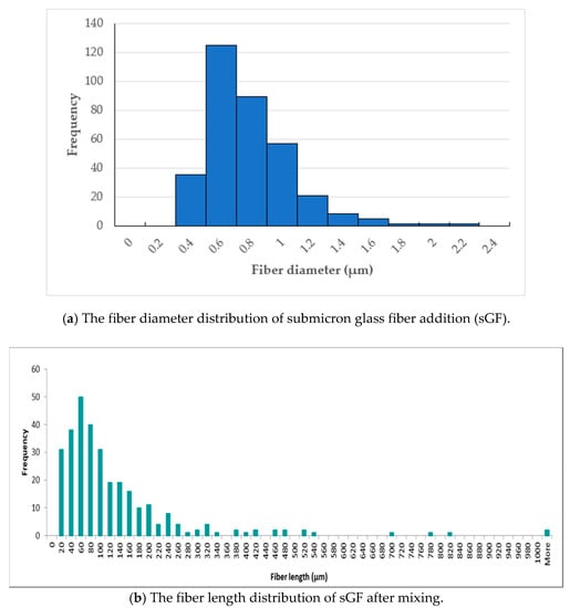 Figure 3a shows the diameter distribution of glass fiber before mixing, whereas Figure 3b indicates the majority of fibers having a length in the range of 20 to 200 µm, a minority of them having an excessively large length up to around 1 mm. Assuming that the diameters of sGF were not affected during sample process, the aspect ratio of sGF was found to be in the wide range. The SEM pictures confirm that the sGFs were well dispersed in the matrix by the conventional mixing technique, as mentioned in Section 2.2, although the original fiber was in agglomeration form (see Figure 4 and Figure 5). Submicron filaments were separated from each other and distributed regularly without fiber curviness.