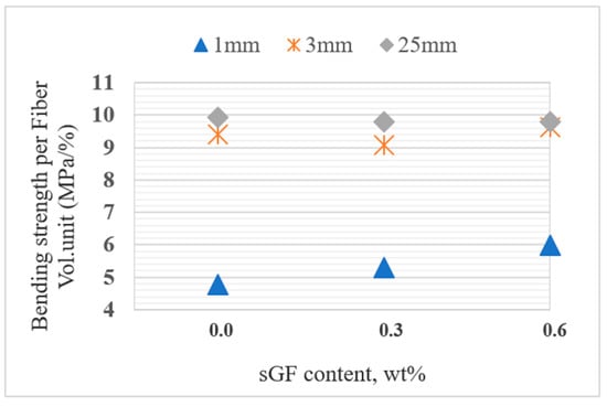 2. The mechanical performance of composites increased with an increase of fiber length, showing significant improvement when fiber length lifted from 1 mm up to 3 mm. However, the bending and tensile strength of 3 and 25 mm were nearly the same when possessing the same volume fraction. This suggests that 3 mm can be considered as “the critical fiber length” in the composite of this research and the potential alternative for longer fibers in some restricted industrial applications. Regarding sGF modification, the effect of the addition of glass fiber can be observed in the case of the 1 mm long fiber and low fiber volume fraction thanks to the improvement of fracture toughness of resin. In other words, modifying the matrix by sGF cannot achieve an improvement in the case of higher fiber concentration and longer fiber because the fiber dictates the behavior in the composite.