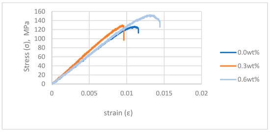 Figure 9, Figure 10 and Figure 11 show the bending stress-bending strain diagram of composites made from 1, 3, and 25 mm long CF, respectively. Regardless of the difference of CF length and sGF content, the bending stress linearly increased until fracture in most of the specimens. Test results also showed that the flexural modulus of composites were almost the same, even if the sGF was added, with the exception of 1 mm composite presenting a marginal increase.