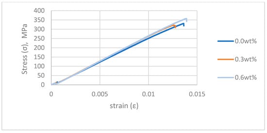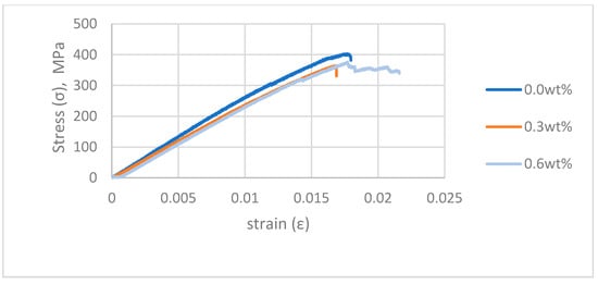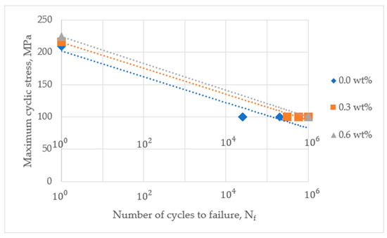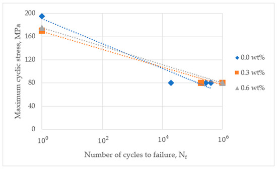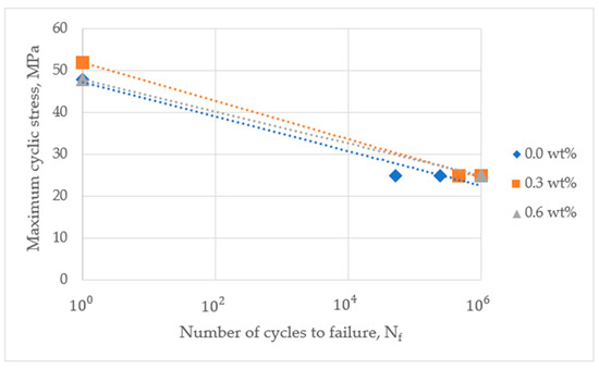 Figure 17, Figure 18 and Figure 19 show the number of cycles to failure of the composites with respect to fiber length. For all cases of fiber length, the fatigue life noticeably extended with the addition of sGF. The increment of cycles to failure was proportional to the content of glass fiber in matrix, regardless of the fiber length. In particular, at 0.6 wt% of modifier, all specimens survived over 1 million cycles. The strain distribution test suggested that sGF prevented the concentration of stress around carbon fiber tips as a result, delaying the propagation of micro-cracks inside the matrix. In our previous research, the number of cycles to failure in the test of compact tension of modified resin also remarkably improved thanks to the addition of glass fiber [26]. Therefore, the enlargement of fatigue life in composites was due to the presence of sGF dissipating energy for deflecting and delaying the propagation of micro-cracks (see Figure 20).